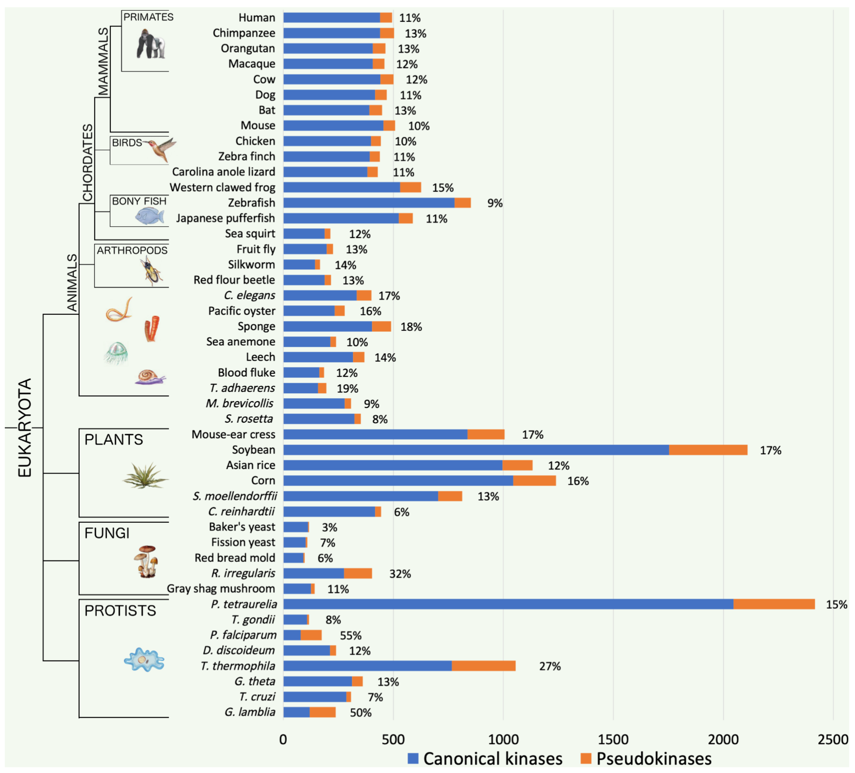 脊椎动物:通常占激酶组含量的约 10% (假激酶组几乎总是与脊椎动物物种中激酶组的大小成正比)