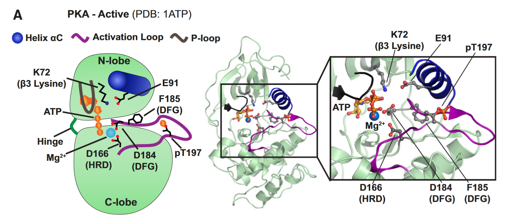 与激酶在催化过程中的相对运动相关的活性位点位于 N 叶和 C 叶之间,由两个叶提供的结构元件组成。