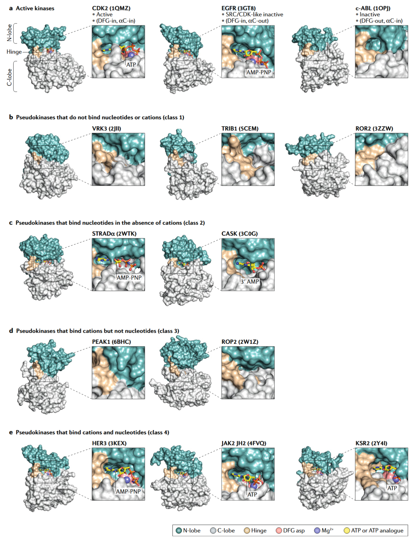 - 结构:此类中的大多数假激酶都缺乏活性激酶 DFG 基序中发现的典型金属配位天冬氨酸残基;